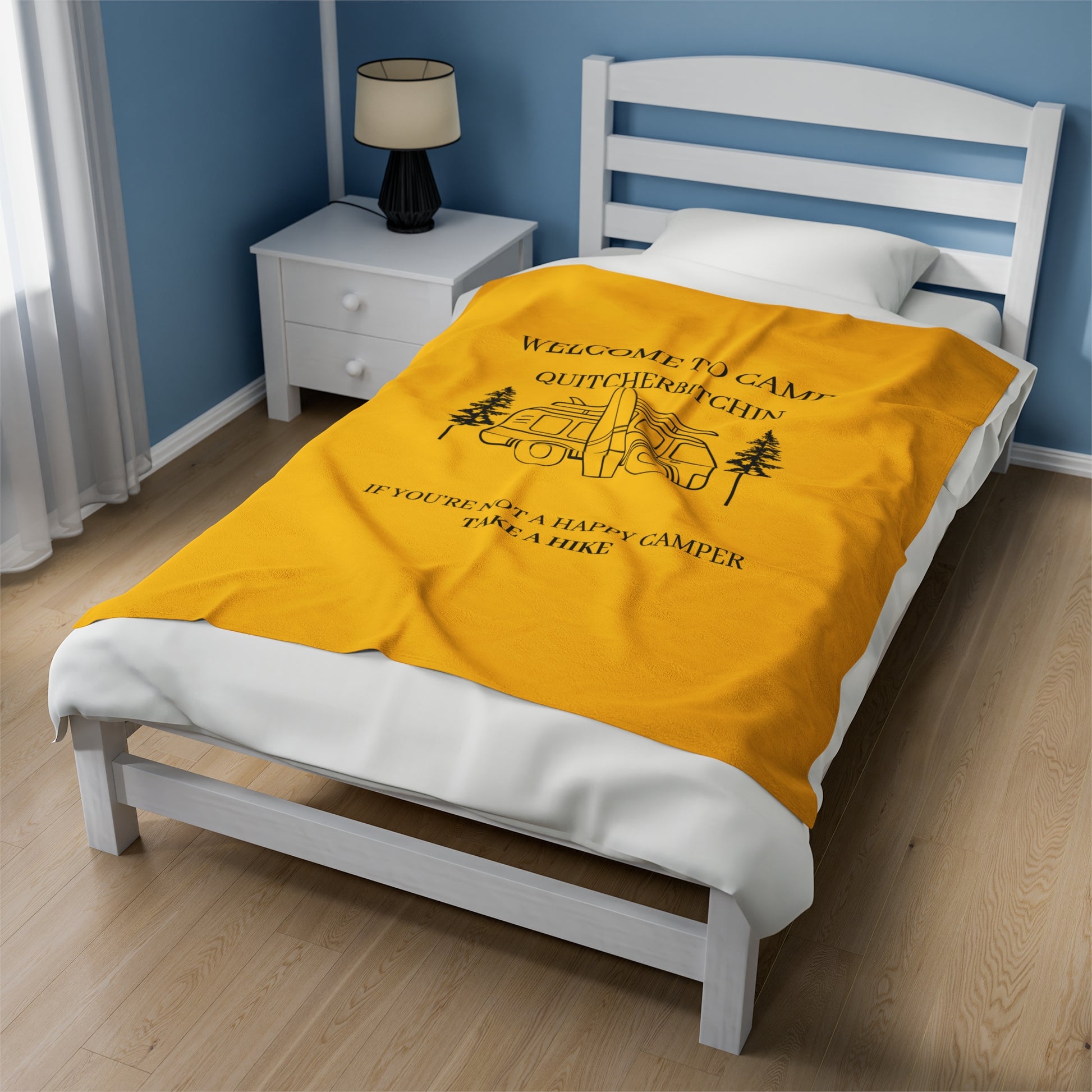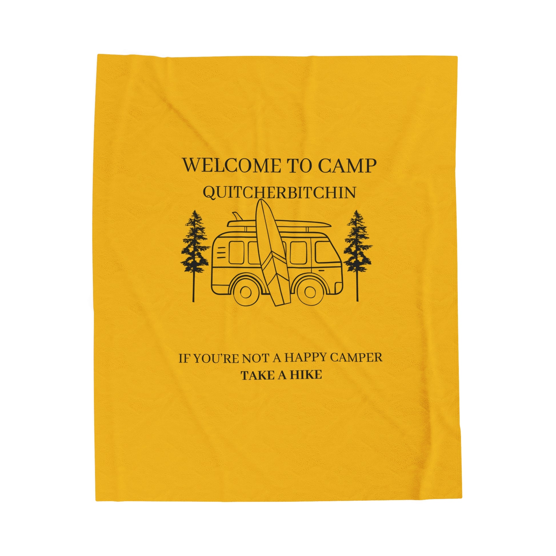Cozy Camping Velveteen Plush Blanket with "Welcome to Camp QUITCHABITCHIN" Design. This blanket gives off a warm and cozy camping vibe, perfect for snuggling up by the campfire or staying warm on chilly nights. Ideal for campers, outdoor enthusiasts, and anyone who loves the great outdoors. Relevant for camping trips, bonfires,
