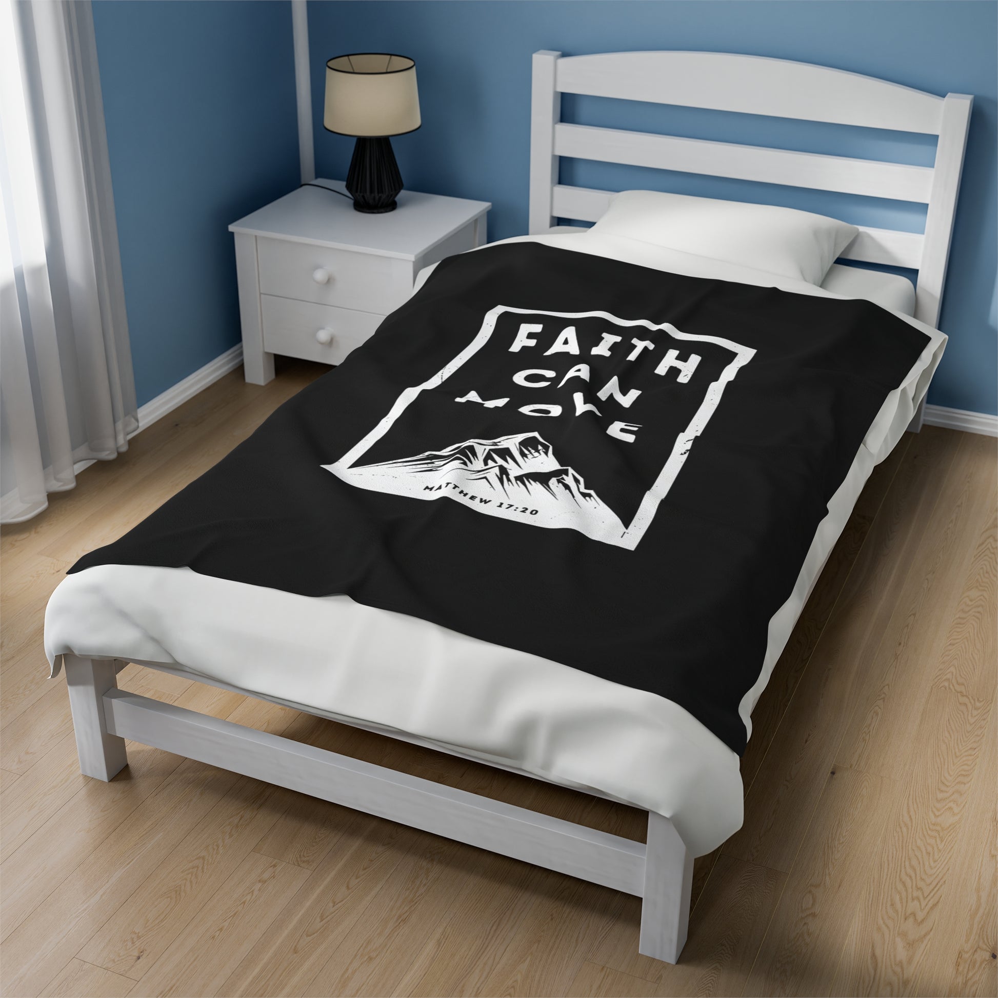 Cozy and inspirational velveteen plush blanket featuring the words 'Faith Can Move'. Perfect for snuggling up on a cold day or offering comfort and warmth to someone in need. Ideal for those seeking motivation and positivity in their everyday life. Great for gifting on occasions such as Christmas, birthdays, or graduations.